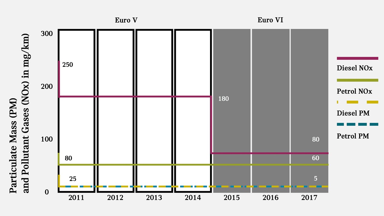 Euro 6 je ime sedanjega standarda emisij izpušnih plinov za onesnaževala. Določa nižje največje vrednosti za emisije trdnih delcev in emisije dušikovega oksida kot EU5. Od meseca septembra 2018* je emisijski standard EU6c postal obvezen, v primerjavi z EU6b pa določa še nižje mejne vrednosti za vsebnost števila trdnih delcev v vozilih z bencinskimi motorji. Enak prag mejnih vrednosti velja za vozila z dizelskimi motorji znotraj cikla za EU6b in EU6c. EU6d-TEMP od meseca septembra 2019* in EU6d od meseca januarja 2021* bosta spet nekoliko znižala prag mejnih vrednosti za število trdnih delcev in dušikovih oksidov v skladu z RDE.