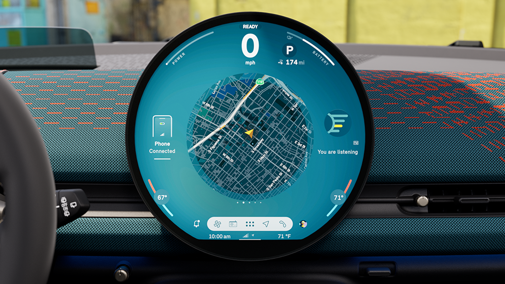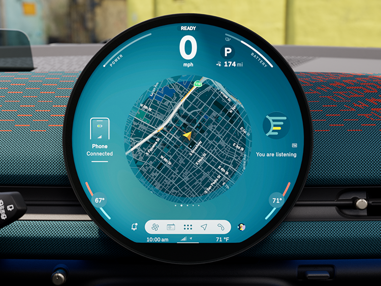 Ikonični, 240-milimetrski osrednji zaslon iz visokokakovostnega stekla je vaša instrumentna plošča ter informacijsko-razvedrilno središče in središče sistemov za pomoč vozniku. Je tudi prvi zaslon okrogle oblike na svetu.